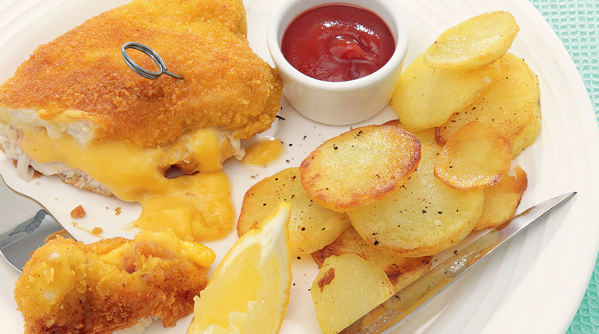 Servidos con patata parisin. Served with parisienne potatoes. Panierte und frittierte hhnchenfilets gefllt mit.