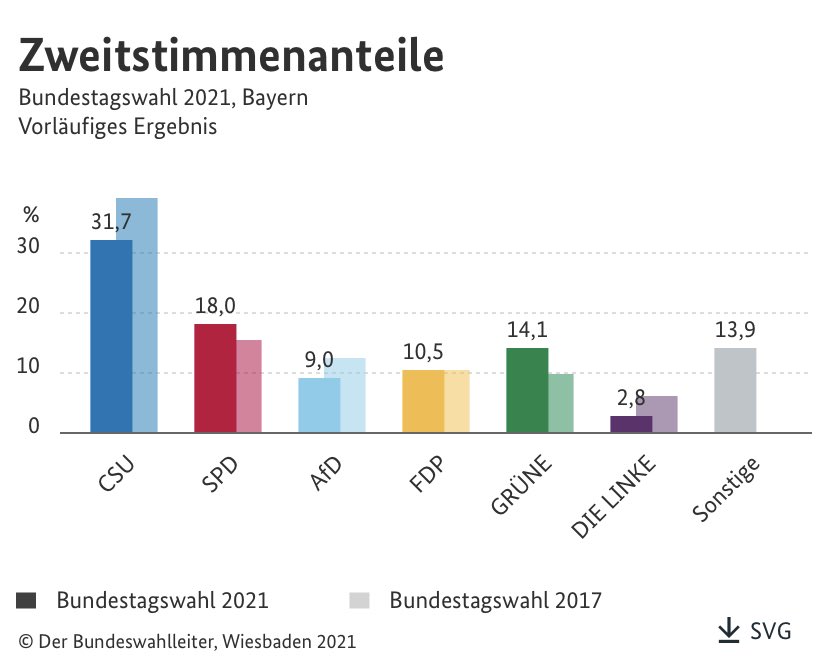 Bundestagswahl 2021 Ergebnisse. Ein Überblick über die 46 Wahlkreise die Direktkandidaten Umfragen vor der Wahl für Bayern und aktuelle Ergebnisse am Wahltag. Diagramm mit den Bundestagswahlergebnissen der Parteien 19492013 und Angabe der.
